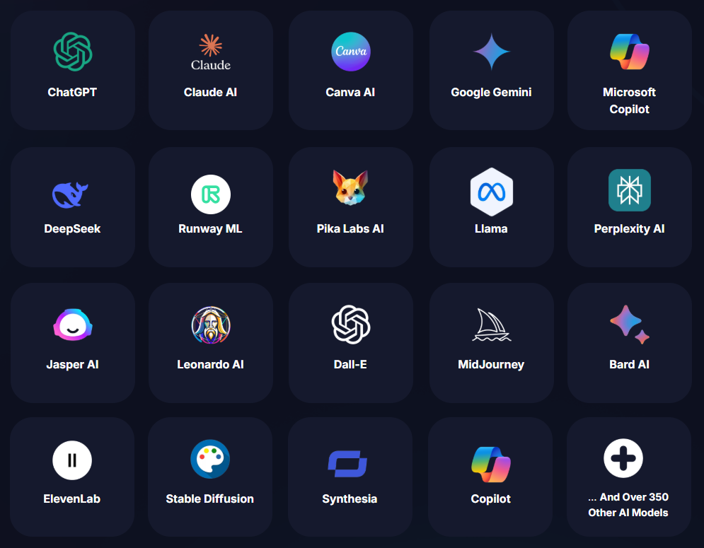 Finally, Access (ChatGPT, DeepSeek, Runaway ML, Leonardo AI, DALL-E, Pika Labs, Canva AI, Claude 3, Gemini, Copilot, Hugging Face, ElevenLab, Llama, MidJourney, AgentGPT, Jasper, Stable Diffusion, Synthesia, Perplexity AI, Open AI Whisper, and 350+ more)